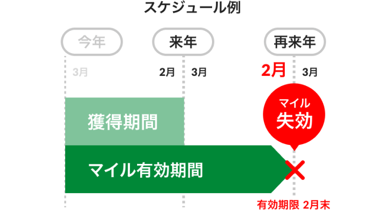 今年の2月末日で有効期限を迎えるのは下記の期間で獲得されたマイルが対象です。