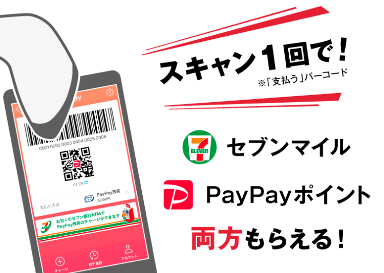 セブン‐イレブンアプリ内のPayPayで支払うと、セブンマイルとPayPayポイントがWで貯まります。いつものお買い物で、マイルもポイントも同時に貯まるのでとてもおトクです。