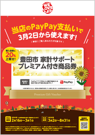申し込みのうえ購入権を取得した愛知県豊田市在住の方は、PayPayアプリから2,000円分のプレミアムが付いた12,000円分の豊田市 家計サポートプレミアム付き商品券(PayPay商品券)を10,000円で購入可能となります。