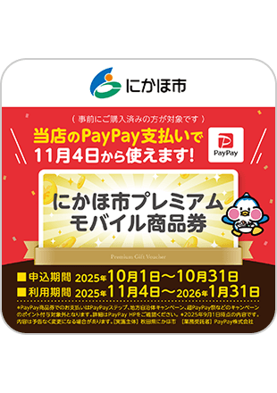 にかほ市プレミアムモバイル商品券取扱店舗でお使いいただけます(一部を除く)。
