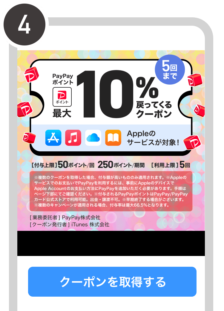 2025年7月28日(金)0:00 〜 2025年8月3日(日)23:59のクーポン期間中、PayPayクーポンページでクーポンを事前に獲得すると、AppleのサービスでPayPay支払いされた際に、最大10%のPayPayポイントを付与します。