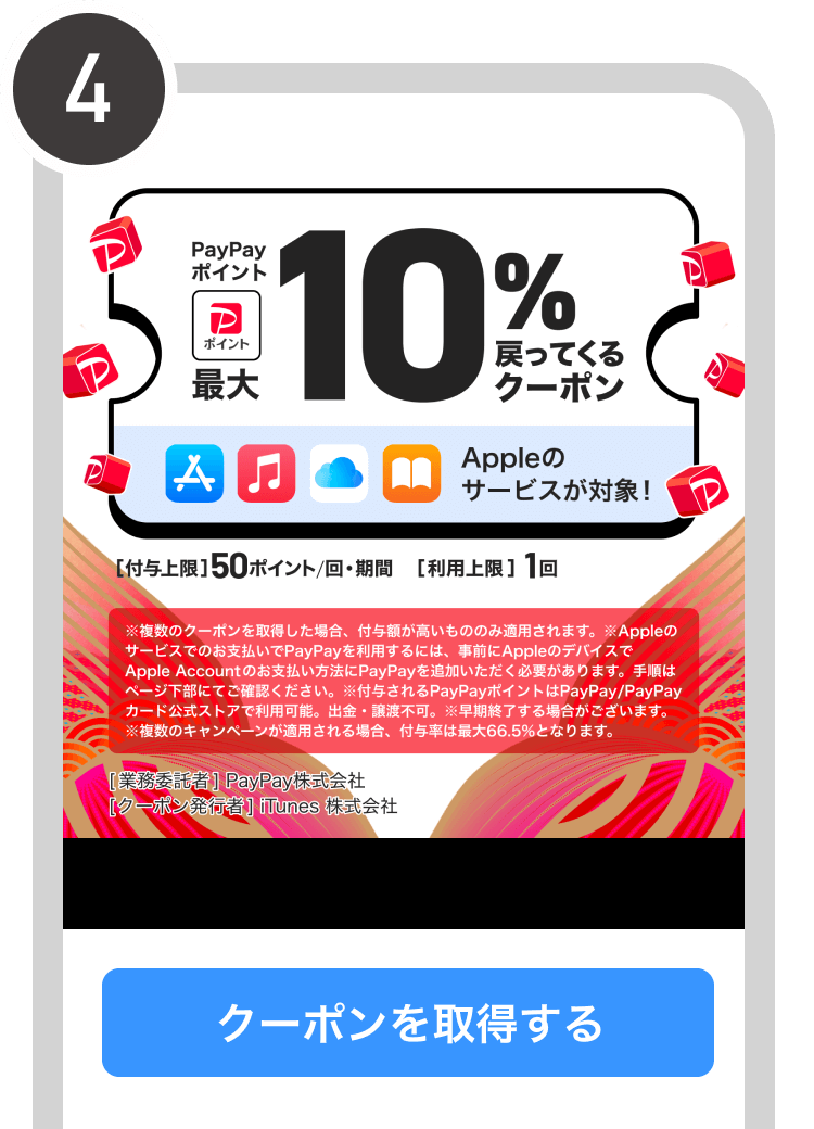 2025/12/15(月)~ 2026/1/6(火)のクーポン期間中、PayPayクーポンページでクーポンを事前に獲得すると、AppleのサービスでPayPay支払いされた際に、最大10%のPayPayポイントを付与します。