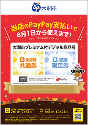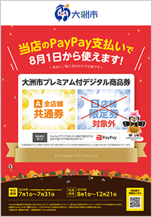 大洲市プレミアム付デジタル商品券の対象店舗のうち指定の店舗で使えます。