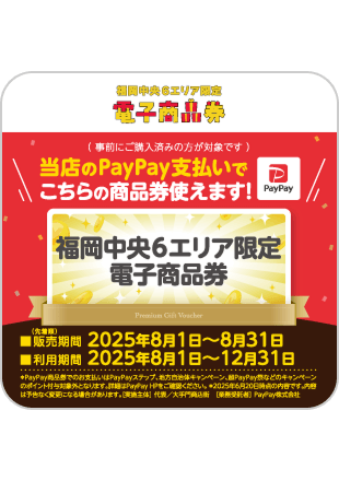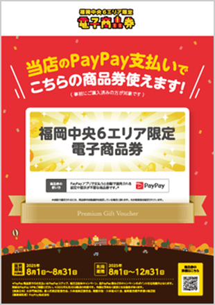 福岡中央6エリア限定電子商品券取扱店舗でお使いいただけます(一部を除く)。
