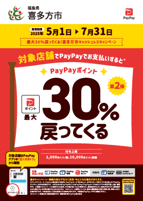 現在開催中の「最大30%戻ってくる!喜多方市キャッシュレスキャンペーン」について、予想を上回るご利用をいただき、キャンペーン特典の付与総額が予定していた上限の金額に達する見込みとなりましたため、2025年6月16日(月)午後11時59分をもってキャンペーンを終了することとなりました。何卒ご理解のほどお願い申し上げます。