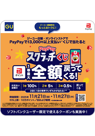 キャンペーン期間中、ジーユーの対象店舗またはオンラインストアで、PayPayクレジット、PayPay残高、PayPayポイント、PayPayデビット(旧PayPay銀行残高)で、3,000円(税込)以上お支払いいただいた際に、2回に1回の確率で、下記のいずれかが当たる※抽選を実施します。当選者には、次の内容でPayPayポイントを付与します。