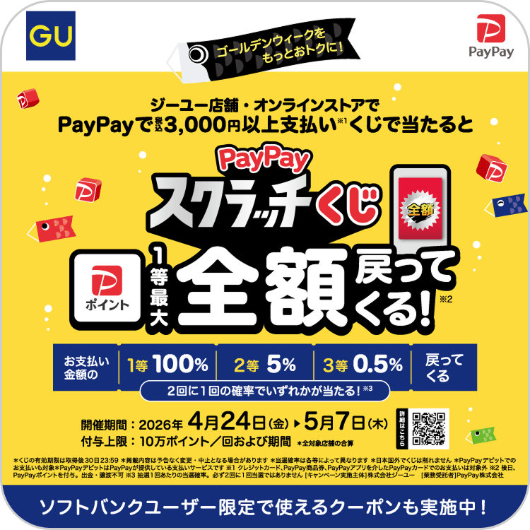 PayPayスクラッチくじと同期間、4/24〜5/7に、ジーユーの全国の店舗とオンラインストアで「GOLDEN WEEK!!」おトクな14日間が開催されます。夏物を中心としたトレンドのアイテムが手に取りやすい価格に!おトクにお買い物をお楽しみください。