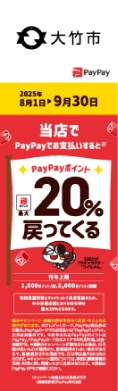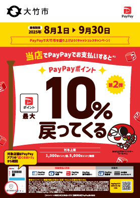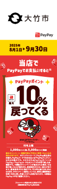- 広島県大竹市内のPayPay加盟店のうちキャンペーンツールの掲出がある店舗です。事前にアプリの「近くのおトク」でもご確認いただけます。