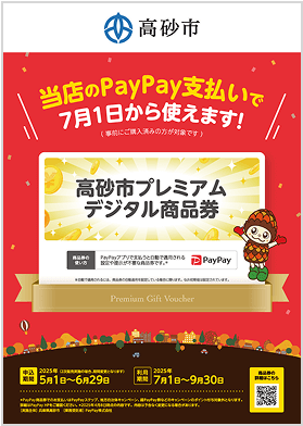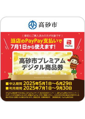 高砂市プレミアムデジタル商品券取扱店舗でお使いいただけます(一部を除く)。