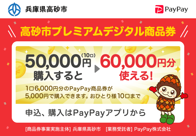兵庫県高砂市民の方は、PayPayアプリから1,000円分のプレミアムが付いた6,000円分の高砂市プレミアムデジタル商品券(PayPay商品券)を5,000円で購入可能となります。