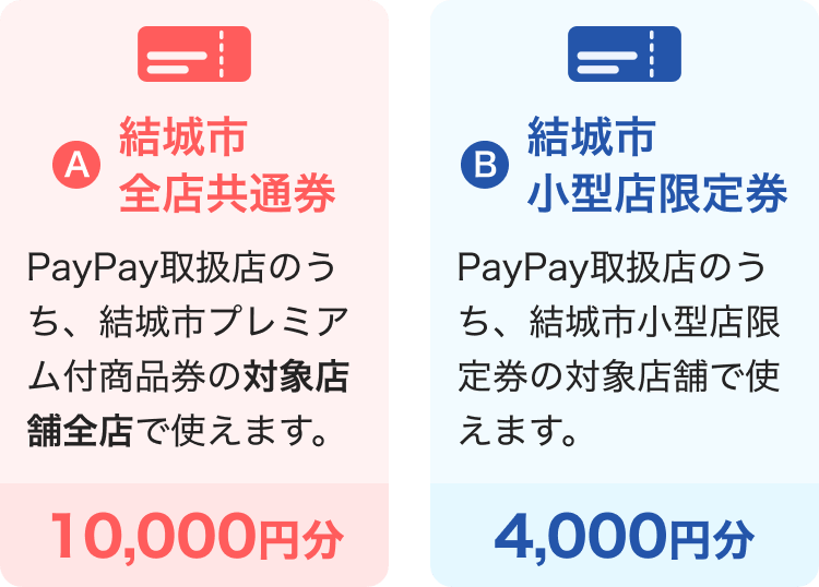 「A結城市全店共通券」と「B結城市小型店限定券」の1口1セット販売となります。