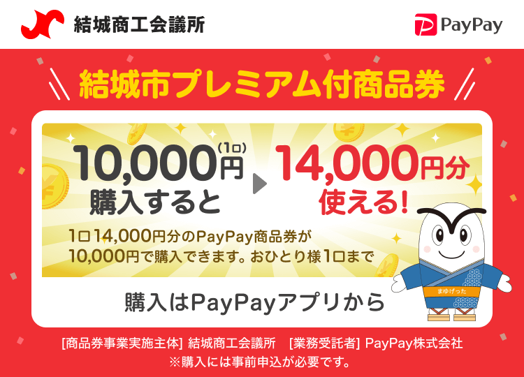 申し込みのうえ商品券コードを取得した茨城県結城市在住の方は、PayPayアプリから4,000円分のプレミアムが付いた14,000円分の結城市プレミアム付商品券(PayPay商品券)を10,000円で購入可能となります。