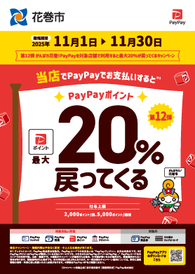 第12弾 がんばれ花巻!PayPayを対象店舗で利用すると最大20%が戻ってくるキャンペーン