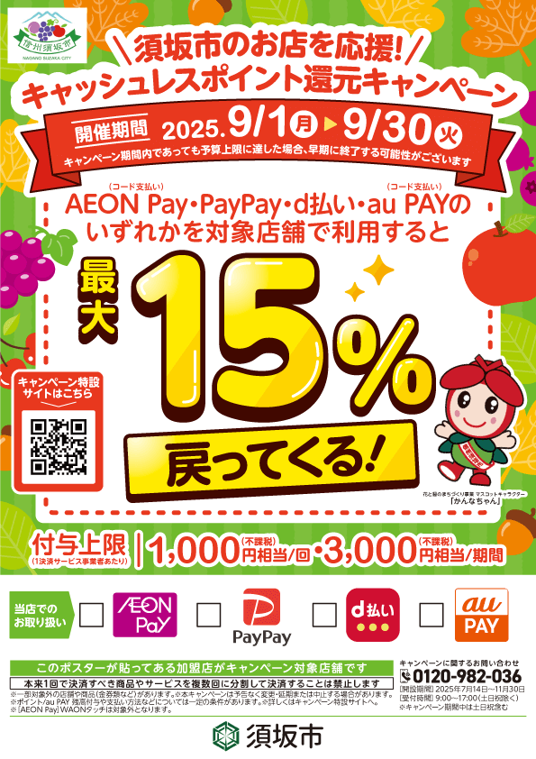 現在開催中の「須坂市のお店を応援!キャッシュレスポイント還元キャンペーン」について、予想を上回るご利用をいただき、キャンペーン特典の付与総額が予定していた上限の金額に達する見込みとなりましたため、2025年9月22日(月)午後11時59分をもってキャンペーンを終了することとなりました。何卒ご理解のほどお願い申し上げます。