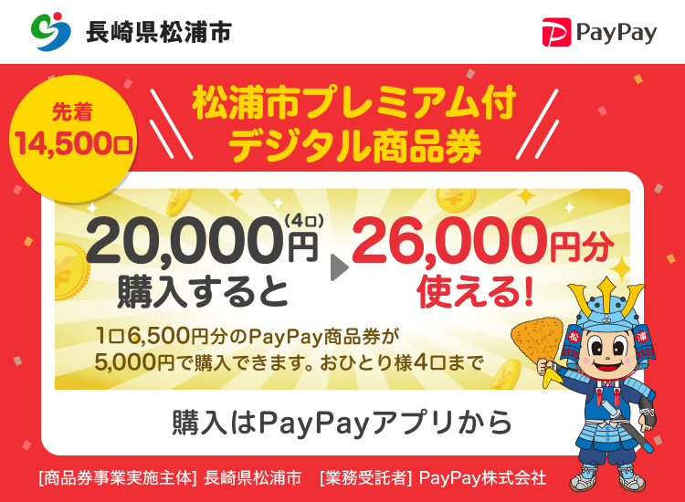PayPayアプリから1,500円分のプレミアムが付いた6,500円分の松浦市プレミアム付デジタル商品券(以下「PayPay商品券」という。)を5,000円で購入いただけます。(先着順)