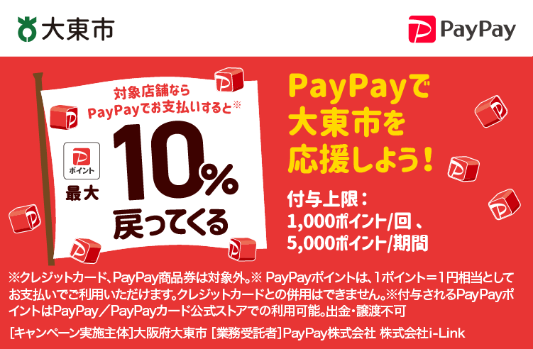 - 大阪府大東市内のPayPay加盟店のうちキャンペーンツールの掲出がある店舗です。事前にアプリの「近くのおトク」でもご確認いただけます。