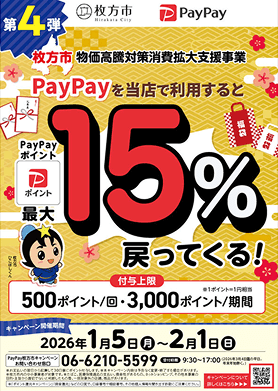 - 大阪府枚方市内のPayPay加盟店のうちキャンペーンツールの掲出がある店舗です。事前にアプリの「近くのおトク」でもご確認いただけます。