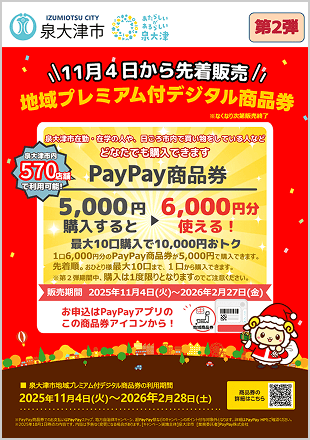 PayPayアプリから1,000円分のプレミアムが付いた6,000円分の泉大津市プレミアム付デジタル商品券(PayPay商品券)を5,000円で購入可能となります。(先着順)