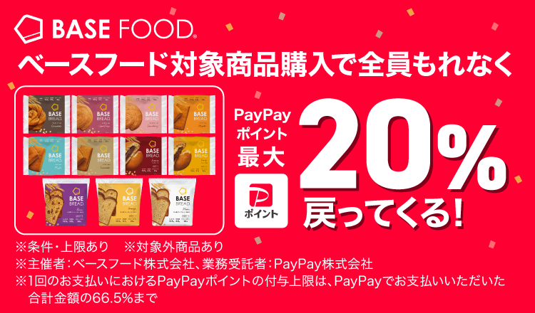 キャンペーン期間中、対象店舗において、ベースフード対象商品を購入され、支払いに「PayPay」をご利用いただいた方に対して、最大20%のPayPayポイントを後日付与。付与上限は1,000ポイント/期間。LINE Pay・Alipay(支付宝)・kakaopay・HIVEX事業者などでのお支払いは対象外です。