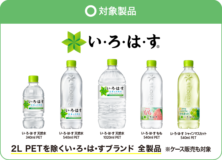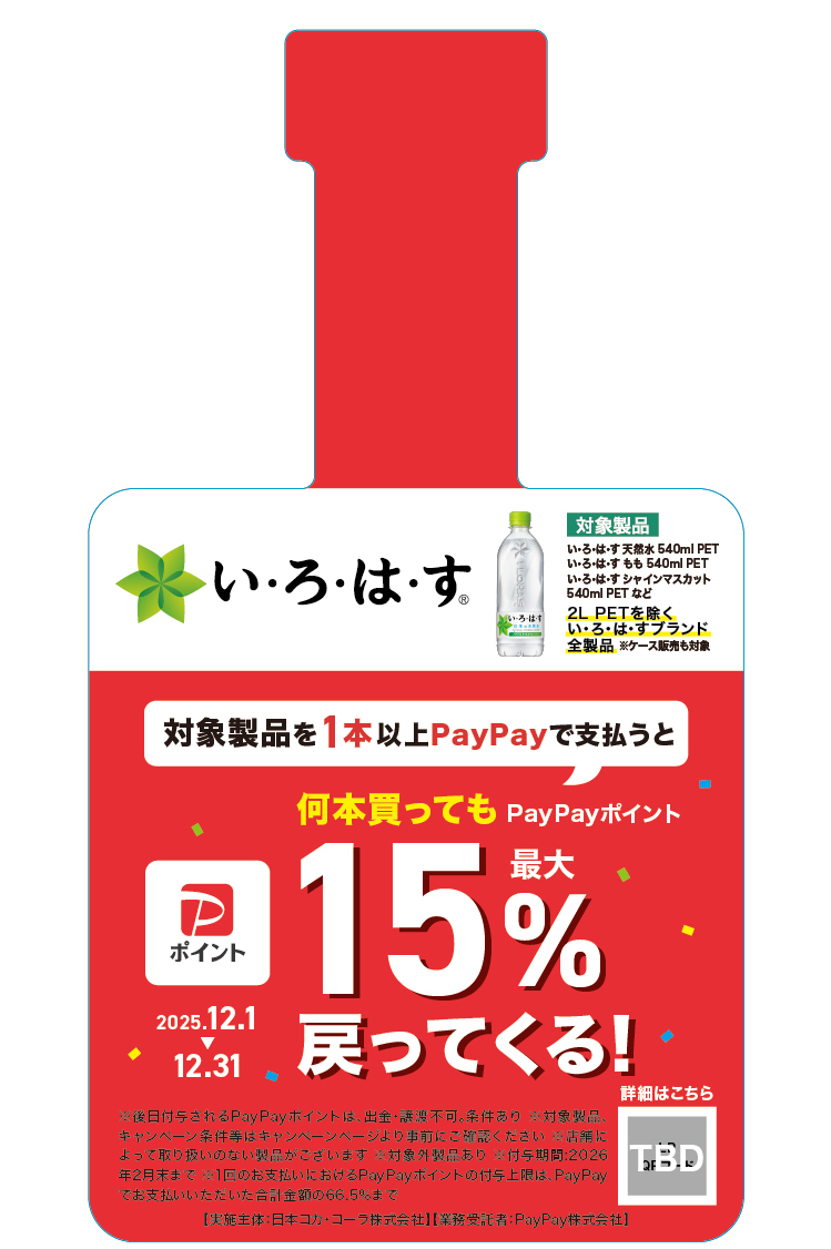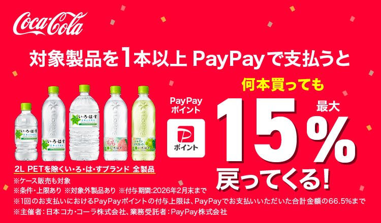 キャンペーン期間中、対象店舗において、い・ろ・は・す(2L PET除く)を1円(税込)以上購入され、支払いに「PayPay」をご利用いただいた方に対して、最大15%のPayPayポイントを後日付与。LINE Pay・Alipay(支付宝)・kakaopay・HIVEX事業者などでのお支払いは対象外です。
