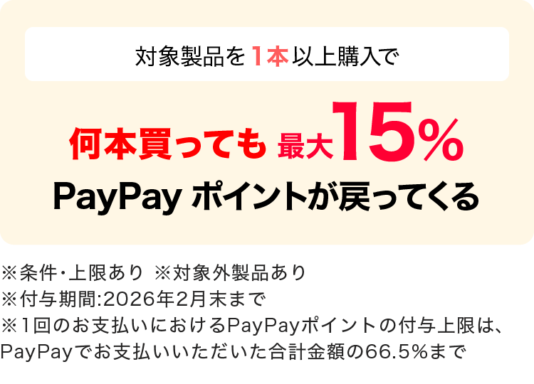 - 1回のお支払いについてのPayPayポイントの付与率は、PayPayでの合計決済額の66.5%が上限となり、PayPayポイントの付与額の合計がPayPayでの1回のお支払いの合計決済額の66.5%を超える場合は、本キャンペーンによるPayPayポイント付与分が縮減される場合があります。