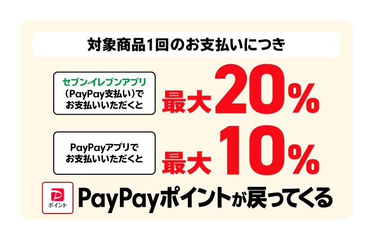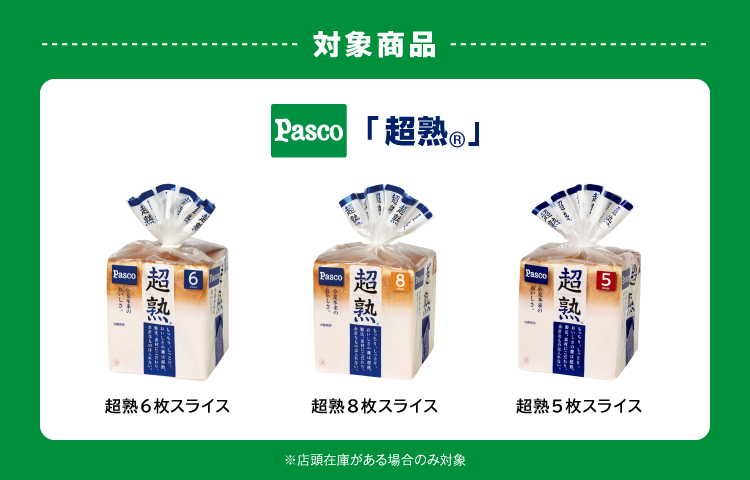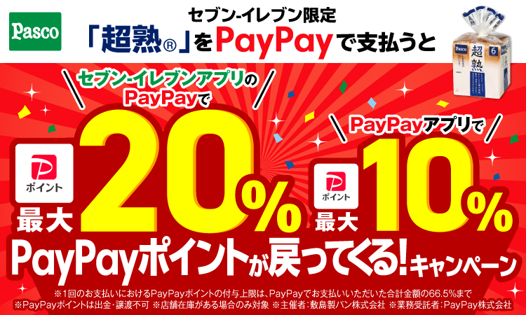 キャンペーン期間中、対象店舗において、Pasco超熟を1円以上(税込)以上購入され、支払いに「PayPay」をご利用いただいた方に対して、最大10%のPayPayポイントを後日付与。セブン-イレブンアプリ(PayPay支払い)の方は最大20%のPayPayポイントを後日付与。付与上限はなし。LINE Pay・Alipay(支付宝)・kakaopay・HIVEX事業者などでのお支払いは対象外です。