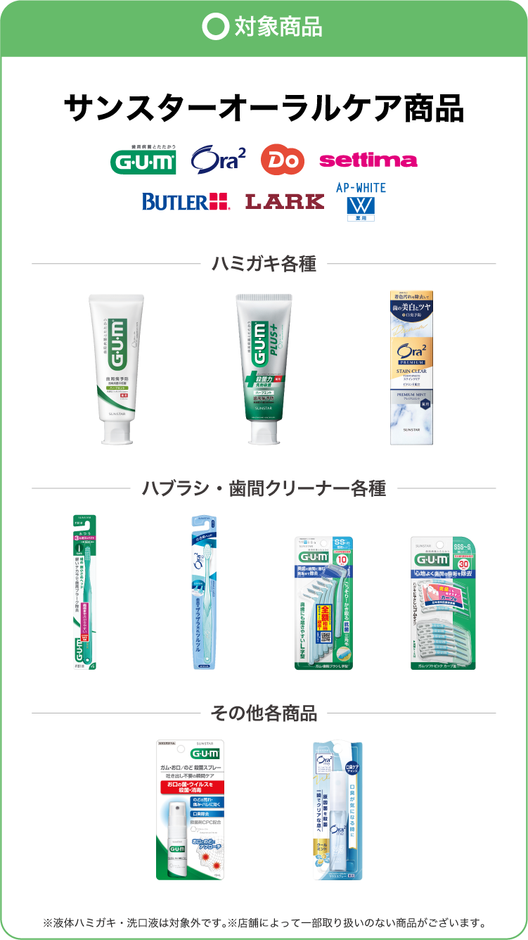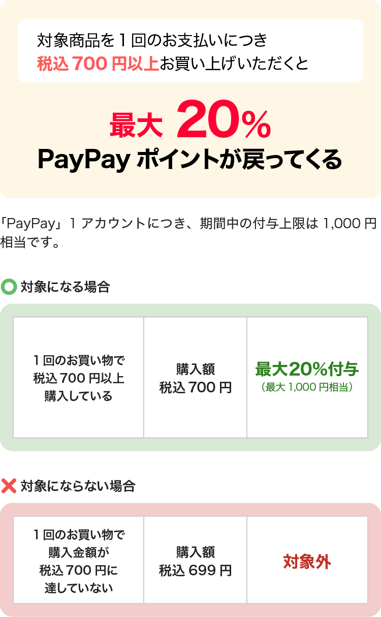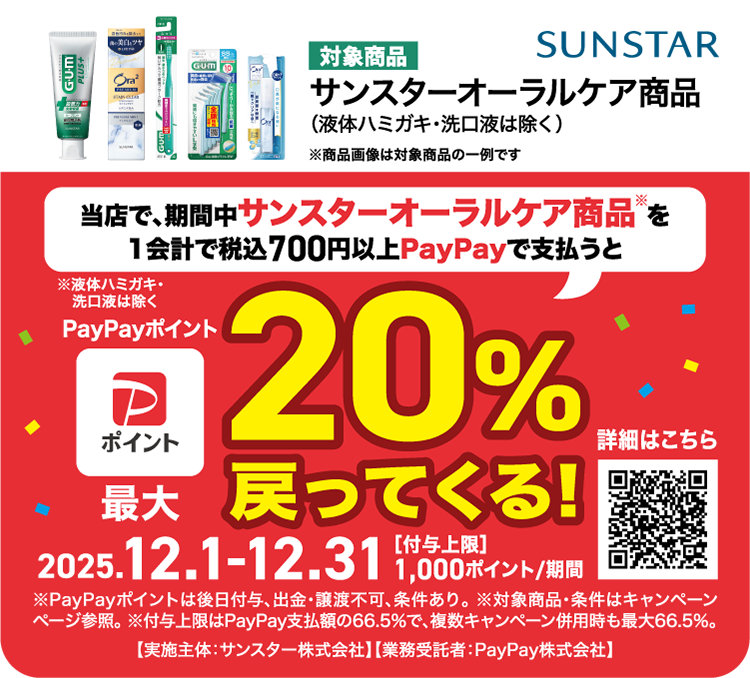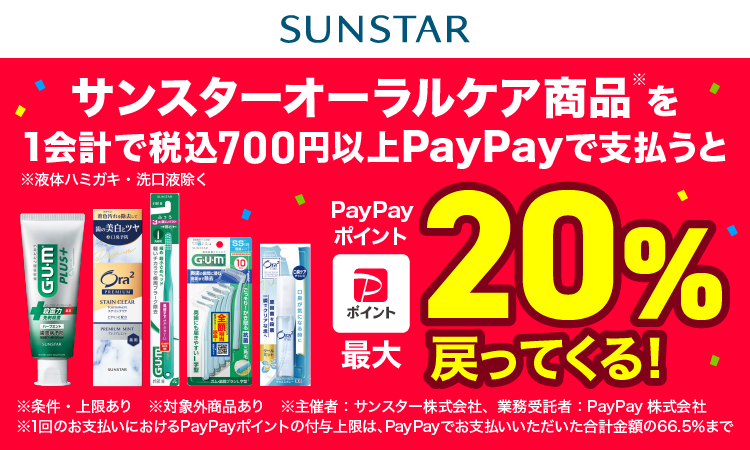 キャンペーン期間中、対象店舗において、サンスターオーラルケア商品(液体ハミガキ・洗口液は除く)を700円(税込)以上購入され、支払いに「PayPay」をご利用いただいた方に対して、最大20%のPayPayポイントを後日付与。付与上限(1決済あたり/期間合計)は1,000ポイント/期間。LINE Pay・Alipay(支付宝)・kakaopay・HIVEX事業者などでのお支払いは対象外です。