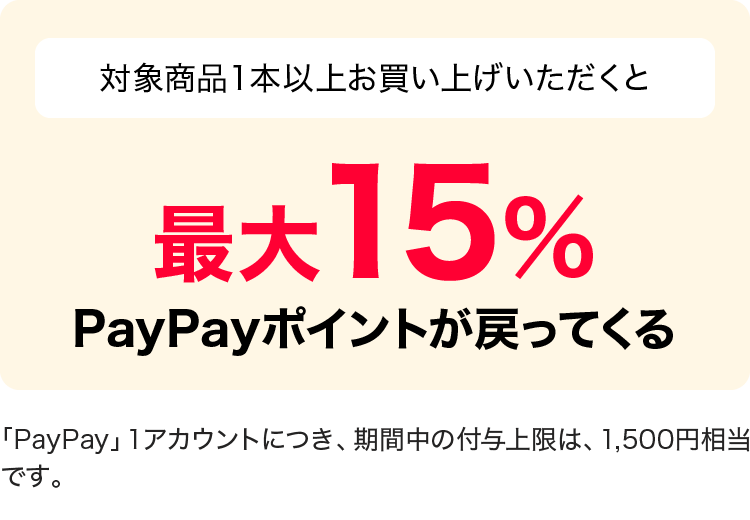 - 1回のお支払いについてのPayPayポイントの付与率は、PayPayでの合計決済額の66.5%が上限となり、PayPayポイントの付与額の合計がPayPayでの1回のお支払いの合計決済額の66.5%を超える場合は、本キャンペーンによるPayPayポイント付与分が縮減される場合があります。