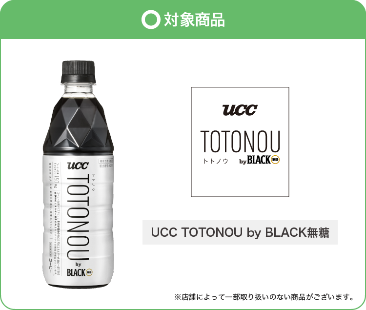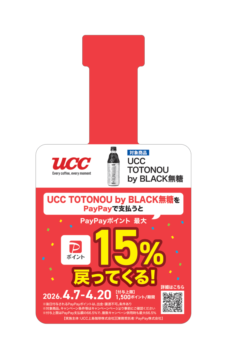 キャンペーン期間中、対象店舗において、UCC TOTONOU by BLACK無糖を1本以上購入し、支払いに「PayPay」をご利用いただいた方に対して、最大15%のPayPayポイントを後日付与。付与上限は1,500ポイント/期間。Alipay(支付宝)・kakaopay・HIVEX事業者などでのお支払いは対象外です。