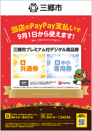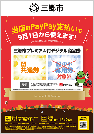 三郷市プレミアム付デジタル商品券の対象店舗のうち指定の店舗で使えます。