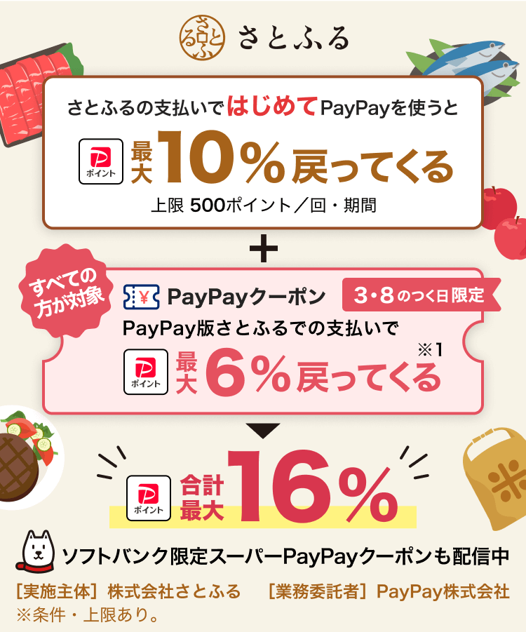 - 本キャンペーンの主催は、株式会社さとふるであり、PayPay株式会社は株式会社さとふるより委託を受けて運営をしております。