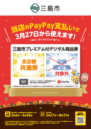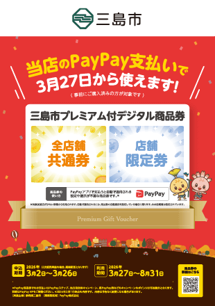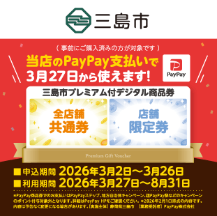 三島市プレミアム付デジタル商品券の対象店舗全店で使えます。