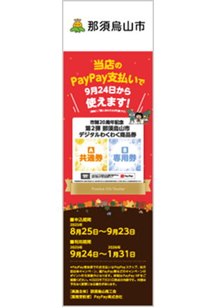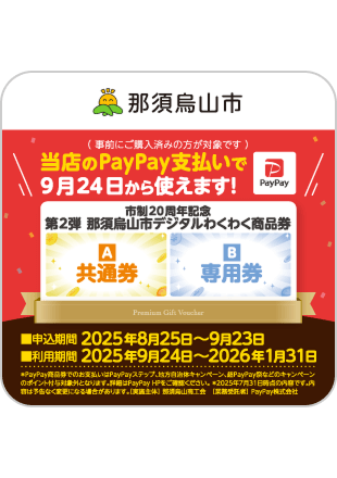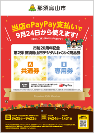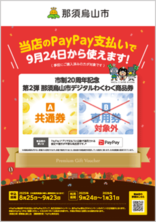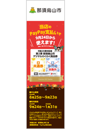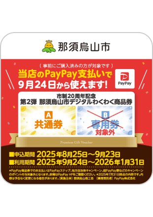 市制20周年記念 第2弾那須烏山市デジタルわくわく商品券の対象店舗のうち指定の店舗で使えます。