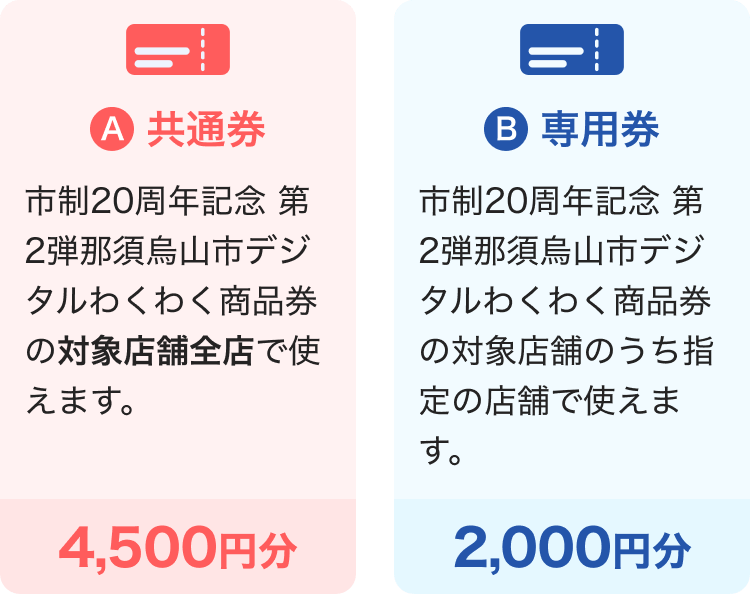 市制20周年記念 第2弾那須烏山市デジタルわくわく商品券は、1口当たり「共通券」と「専用券」のセット販売となります。1セット6,500円分 = 共通券4,500円分 + 専用券2,000円分です。