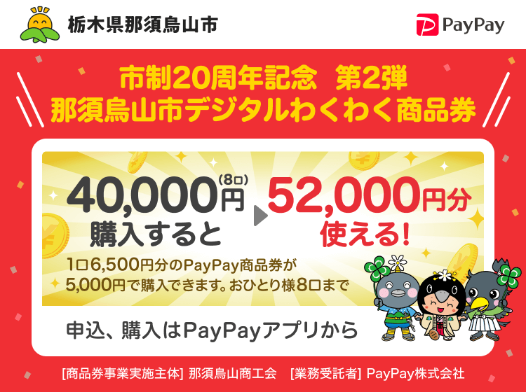 栃木県那須烏山市在住の方は、PayPayアプリから1,500円分のプレミアムが付いた6,500円分の市制20周年記念 第2弾那須烏山市デジタルわくわく商品券(PayPay商品券)を5,000円で購入可能となります。(先着順)