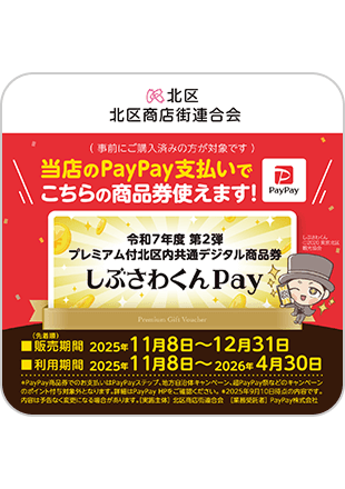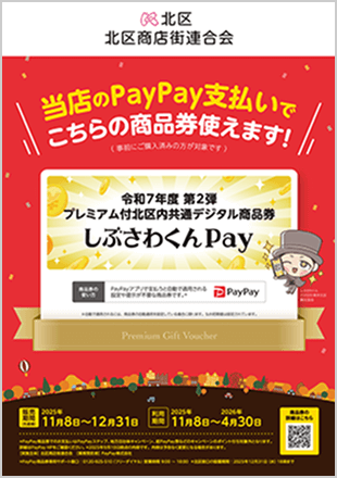 北区商店街連合会の「令和7年度 第2弾プレミアム付北区内共通デジタル商品券 しぶさわくんPay」取扱店舗でお使いいただけます。