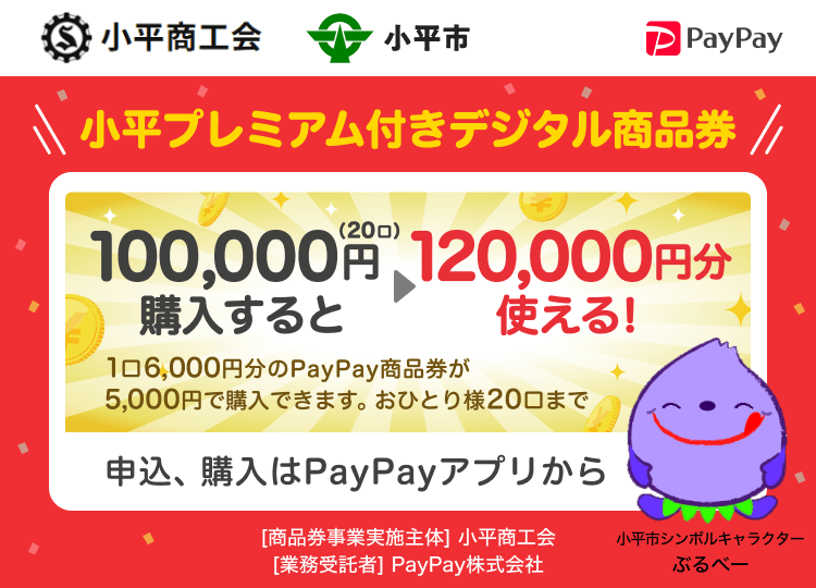 PayPayアプリから1,000円分のプレミアムが付いた6,000円分の小平プレミアム付きデジタル商品券(PayPay商品券)を5,000円で購入可能となります。(先着順)