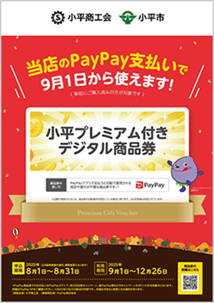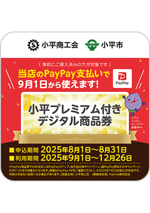 小平プレミアム付きデジタル商品券取扱店舗でお使いいただけます(一部を除く)。