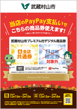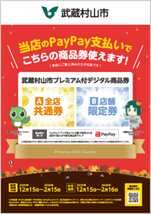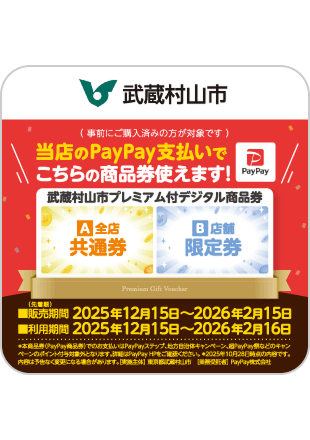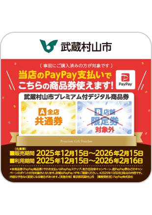 武蔵村山市プレミアム付デジタル商品券の対象店舗のうち指定の店舗で使えます。