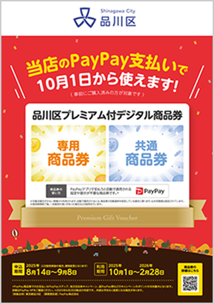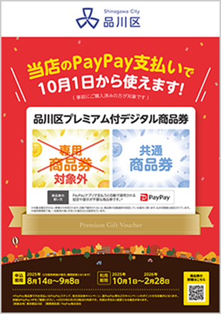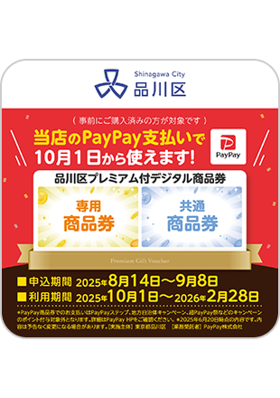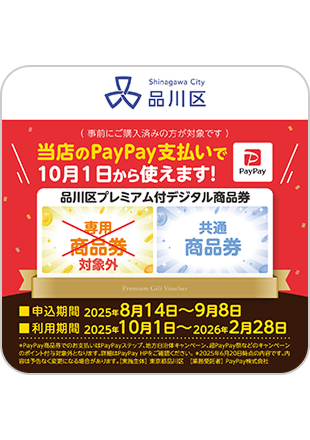 品川区プレミアム付デジタル商品券の対象店舗のうち指定の店舗で使えます。