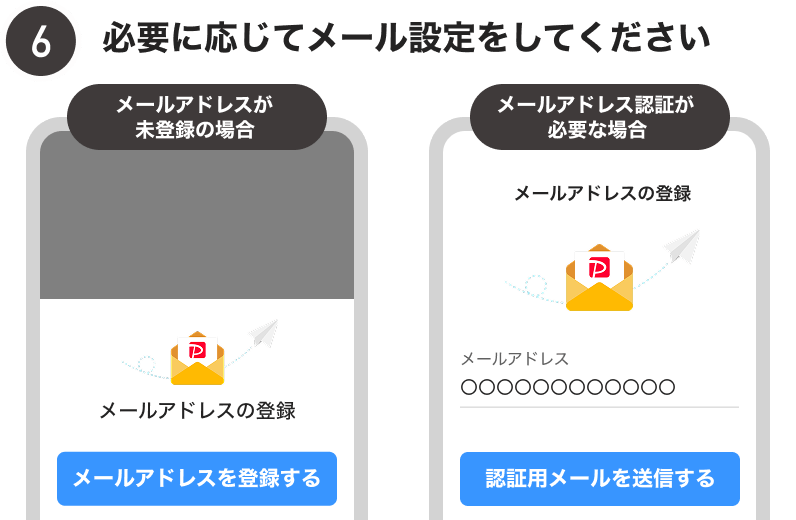 認証メールは「info@paypay-corp.co.jp」のメールアドレスから配信いたします。受信拒否設定をしている場合は、上記メールアドレスからの受信を許可してください。それでも届かない場合、恐れ入りますが他のメールアドレスでの認証をお試しください。