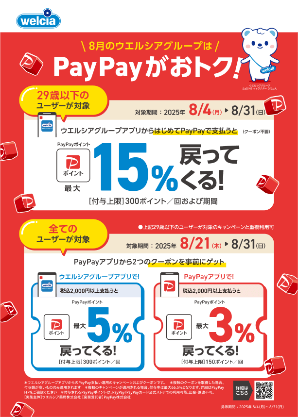※ PayPay商品券、クレジットカード、PayPay残高カードは対象外。PayPayカードでのお支払いは「PayPayクレジット」以外は対象外となります。 ※ 付与されるPayPayポイントはPayPay/PayPayカード公式ストアでも利用可能。出金・譲渡不可。 ※ 本キャンペーンの対象はウエルシアグループアプリからPayPayでお支払いいただいた場合のみ対象です。PayPayアプリからお支払いいただいた場合は本キャンペーンの対象外となります。