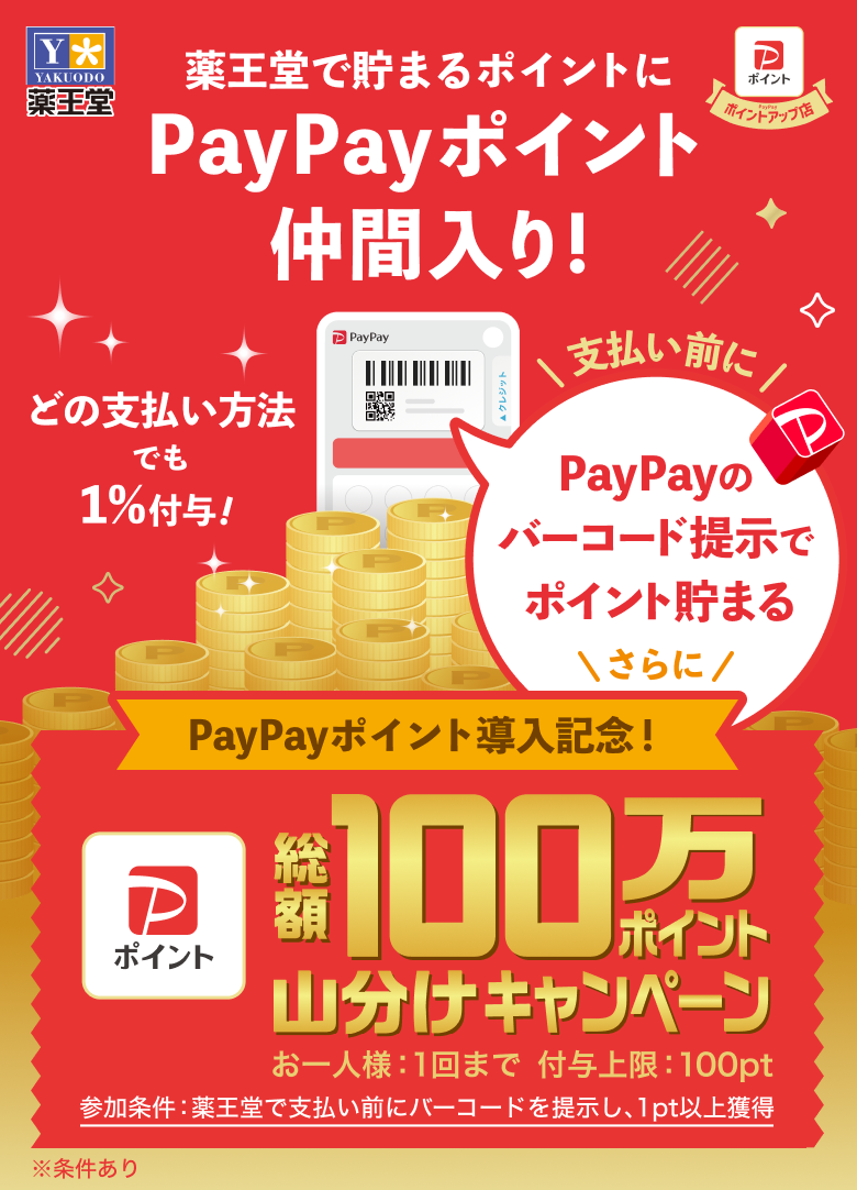 [薬王堂でPayPayポイントを貯めよう。総額100万PayPayポイント山分けキャンペーン]
