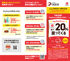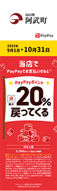 - 山口県阿武町内のPayPay加盟店のうちキャンペーンツールの掲出がある店舗です。事前にアプリの「近くのおトク」でもご確認いただけます。