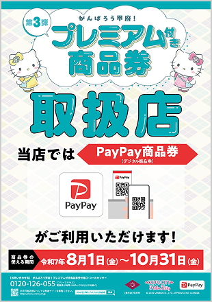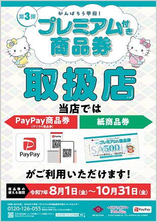 甲府市プレミアム付き商品券第3弾取扱店舗でお使いいただけます(一部を除く)。