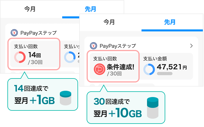 PayPay加盟店にて、1か月間に1決済あたり200円以上の、以下の適用条件で定めるPayPayでの決済を行った回数と当該決済の翌月(特典受取月)に適用中の料金プランに応じて、特典受取月の月末まで利用できるデータ容量を料金プランのデータ容量に追加するキャンペーン