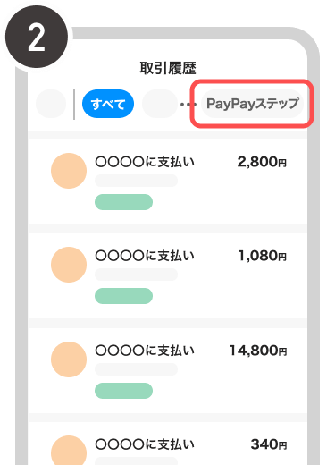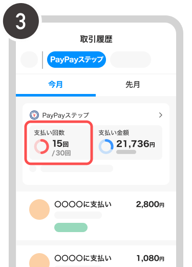 PayPayアプリ>取引履歴>PayPayステップの順に遷移して以下画面にて達成状況をご確認ください。(くわしい手順はこちら)