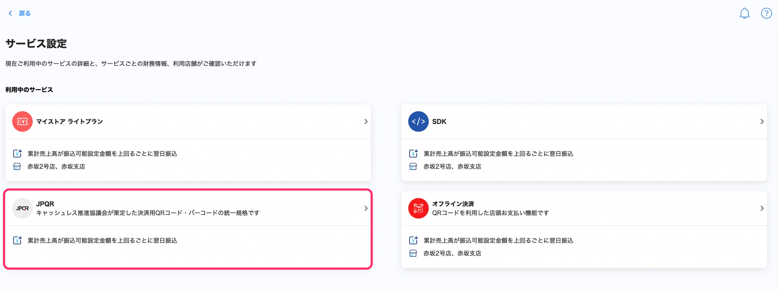 [利用中のサービス]に表示されている[JPQR]を押すと、JPQRのサービス設定画面が表示されます。