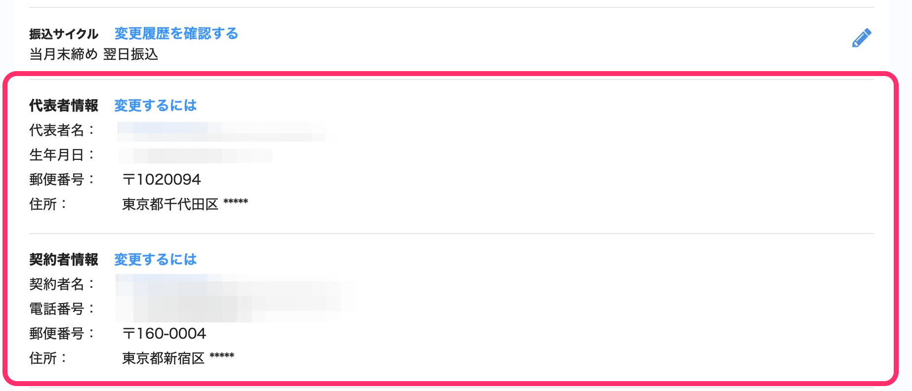 ブランド情報下部の「代表者情報」「契約者情報」は、登録している事業形態やユーザーアカウントの種類によって、表示される項目が変わります。