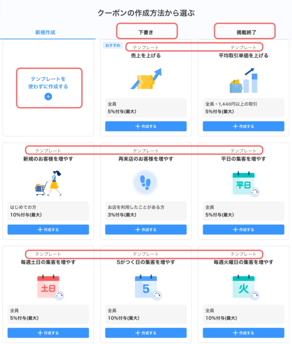 | 掲載終了から作成する | 掲載終了したクーポンをコピーして作成できます |